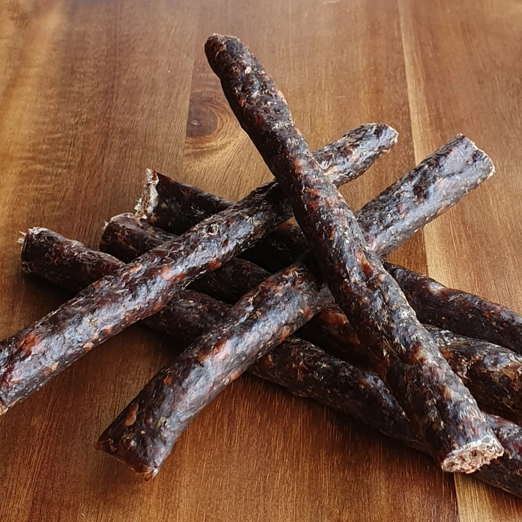 호주산 소 어깨살을 하룻밤 마리네이드한 후 갈아서 양 케이싱에 넣었습니다. 안전상의 이유로 드뢰워스에는 질산염을 첨가해요.